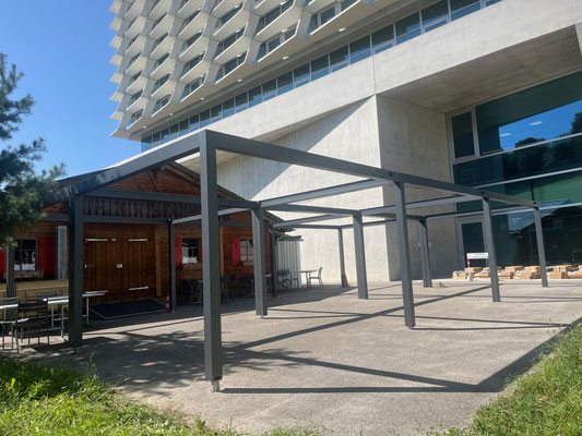 für den Pavillon zu setzen. So wurde der Pavillon exakt ausnivelliert, losgelöst von der Neigung des Terrains und gegen Aufwinde durch die landenden und startenden REGA-Helikopter sicher