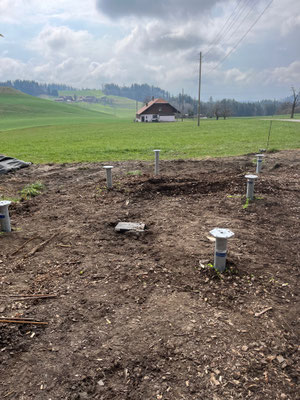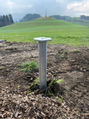 Mitten im schönen Emmental wurde eine Fundierung mitten in der Landwirtschaftszone errichtet. Um den Boden zu schonen und jederzeit wieder ohne Schäden am Boden rückgängig machen zu können, wurde hier auf Schraubfundamente zurückgegriffen.